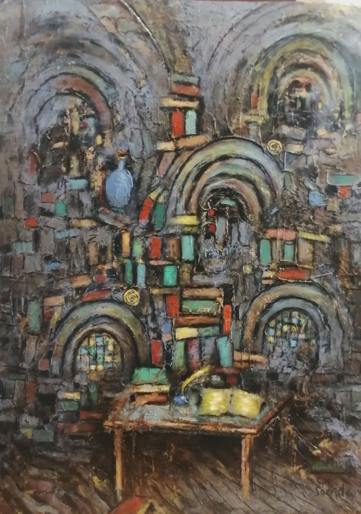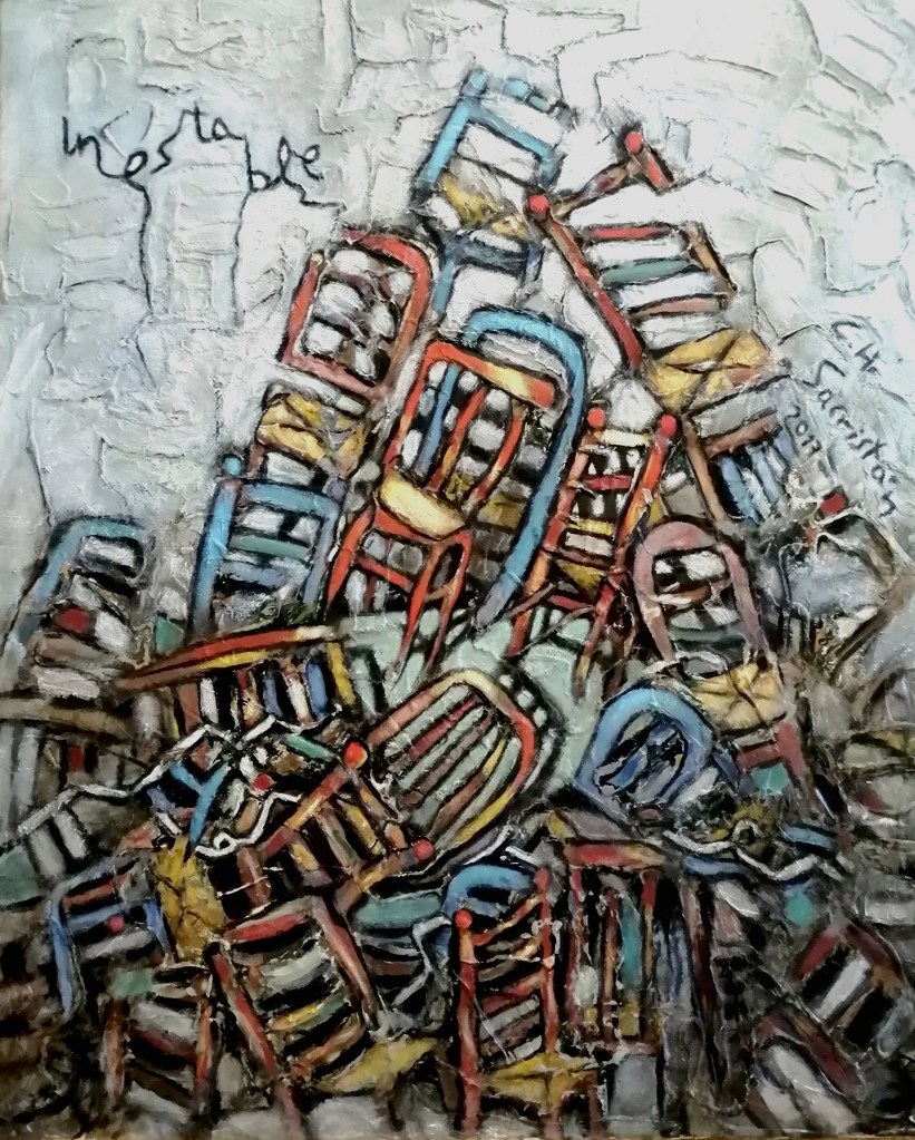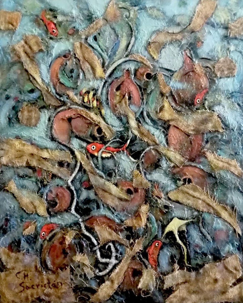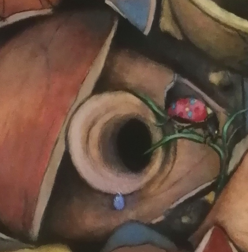 Although not exclusively, the compositional technique offers fragments and iterations with which the ideal object, lost in the avatars of the world, is reconstructed. Pictorial activity no longer seeks to reproduce this ideal object, but rather transforms it, to a greater or lesser extent, with lots of room for surprise for the painter himself. Only in this sense can painting be understood as a practice of discovery or revelation. This is the procedure followed in Pitcher’s Soul, to which I have dedicated a short poem.
