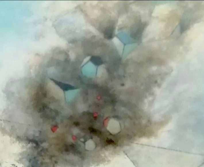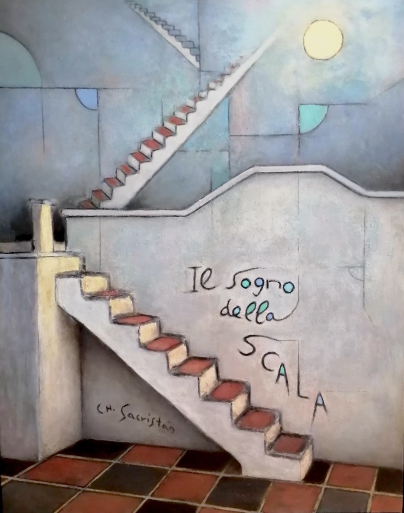 The symbolic transformation of the object can sometimes mean that we make it dream along with us. Here we have a photographic shot of the port of Gdansk (Poland) and its symbolic version under the title Polyhedral dream. The detail of the composition shows how the smoke from the chimneys is reinterpreted as the dream of the houses. If they are ultimately polyhedrons, polyhedrons must necessarily be present in their dreams (and indeed in ours). Another version of the dream of things is offered in Il sogno della scala.
