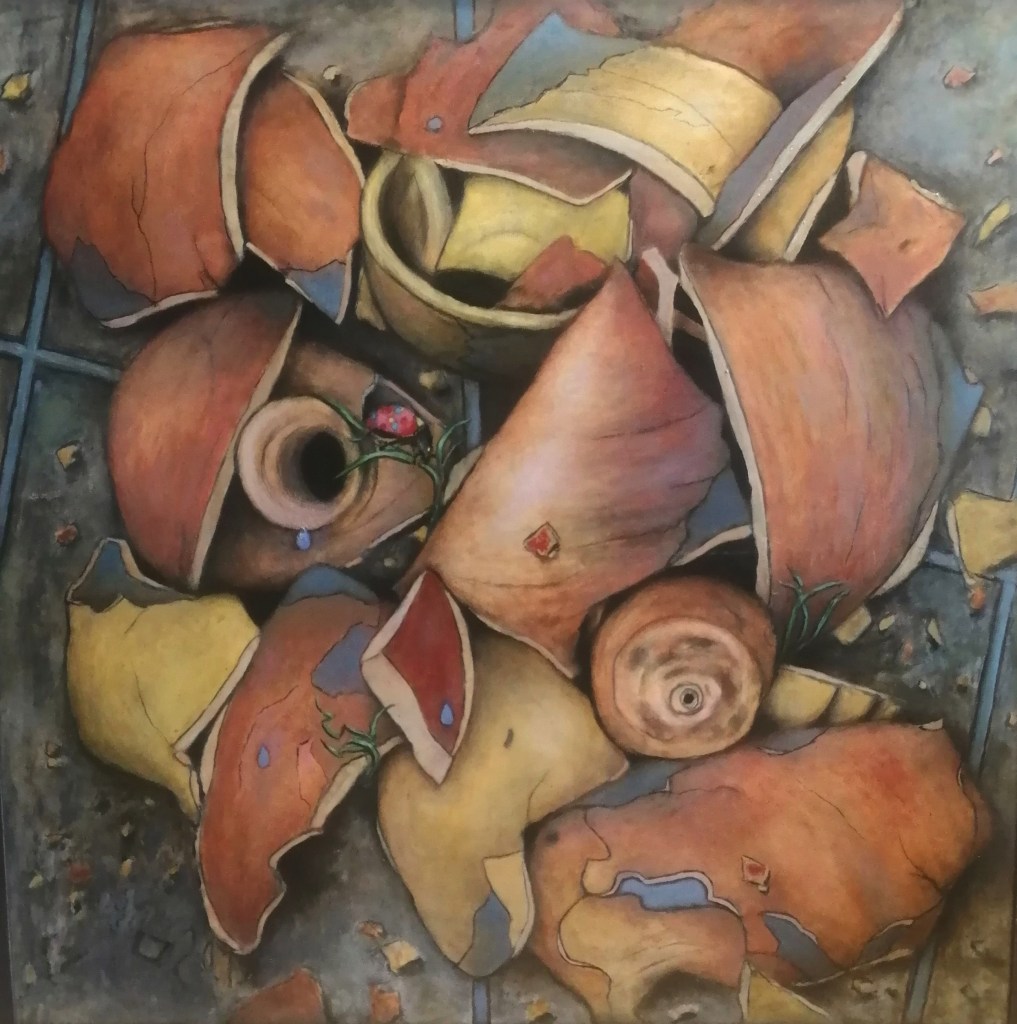 Aunque no exclusivamente, la técnica compositiva ofrece fragmentos e iteraciones con los que se reconstruye el objeto ideal perdido en los avatares del mundo. La actividad pictórica no trata ya de reproducir ese objeto ideal, sino que la transforma, en mayor o menor medida, con un amplio margen de sorpresa para el propio pintor. Solo en este sentido la pintura puede entenderse como una práctica de descubrimiento o desvelamiento. Este es el proceder seguido en Alma de cántaro.